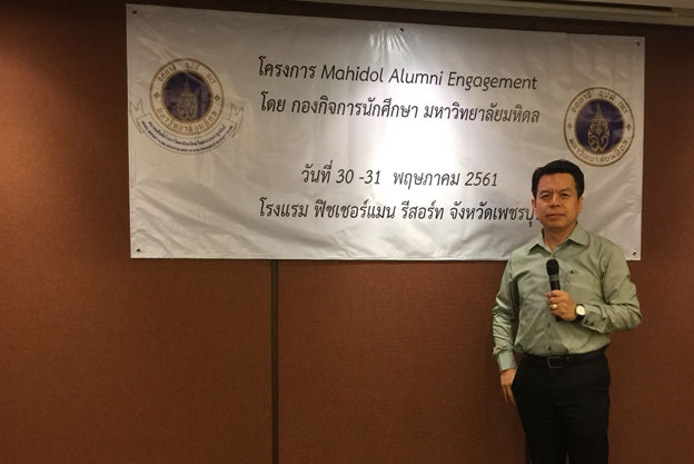 ผศ.ชัยวัฒน์ วงศ์อาษา หัวหน้าภาควิชาอนามัยครอบครัว วิทยากรงานสัมมนา โครงการ Mahidol Alumni Engagement โดย กองกิจการนักเรียน มหาวิทยาลัยมหิดล ณ โรงแรม ฟีชเชอร์แมน รีสอร์ท จังหวัดเพชรบุรี